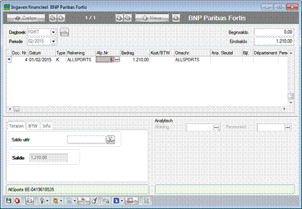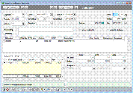 De BTW-aangifte wordt op de klassieke manier opgemaakt. Doordat er geen gebruik gemaakt werd van het vak Btw-overdracht bij de ingave, zal de financiële boeking van 02/2015 geen rol spelen in het bepalen van de aangifteperiode. De factuur wordt opgenomen in de aangifteperiode 01/2015, die overeenkomt met de uitgifteperiode van de factuur.